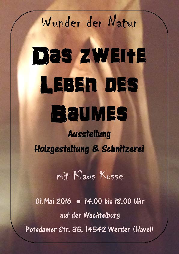 Die Adventgemeinde Werder (Havel) in Kooperation mit dem Förderverein „Freundeskreis Wachtelburg“ e.V. stellt den Hobby-Schnitzer Klaus Kosse und seine Kunstwerke auf der Wachtelburg am 1.Mai 2016 vor. Am Nachmittag werden die Besucher etwas über die Lebensphilosophie des Künstlers und die Entstehungsgeschichte ausgewählter Kunststücke erfahren und auch zahlreiche Exponate in natura erblicken können. Klaus Kosse, der seit über 50 Jahren gerne schnitzt, wird spannende Sachen über die „Wiedergeburt“ eines Baumes und die unterschiedlichen Holzarten, die er in seiner Tätigkeit bisher verwendet hat, erzählen. Auch den jungen Hobby-Schnitzern möchte er gerne aus seinem Erfahrungsschatz praktische Hinweise zur künstlerischen Holzbearbeitung mitgeben.